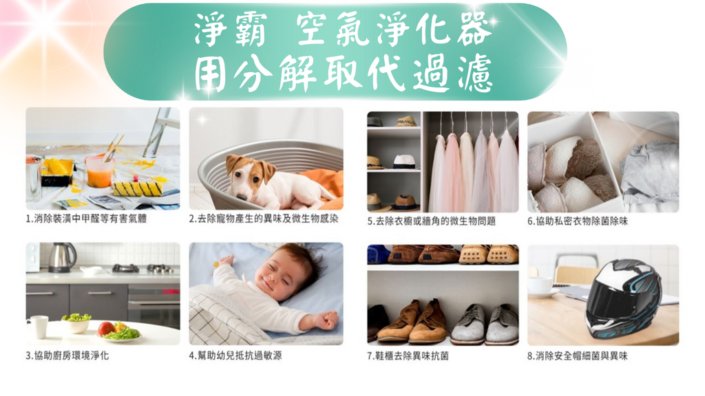 淨霸使用的是一種光觸媒技術與主動釋放淨化因子的方式,能主動分解氣味與過敏原。不像傳統濾網只能被動吸附,它更像是一個「會主動出擊」的清潔小幫手,把空氣中懸浮的細菌、病毒和異味全部處理掉。